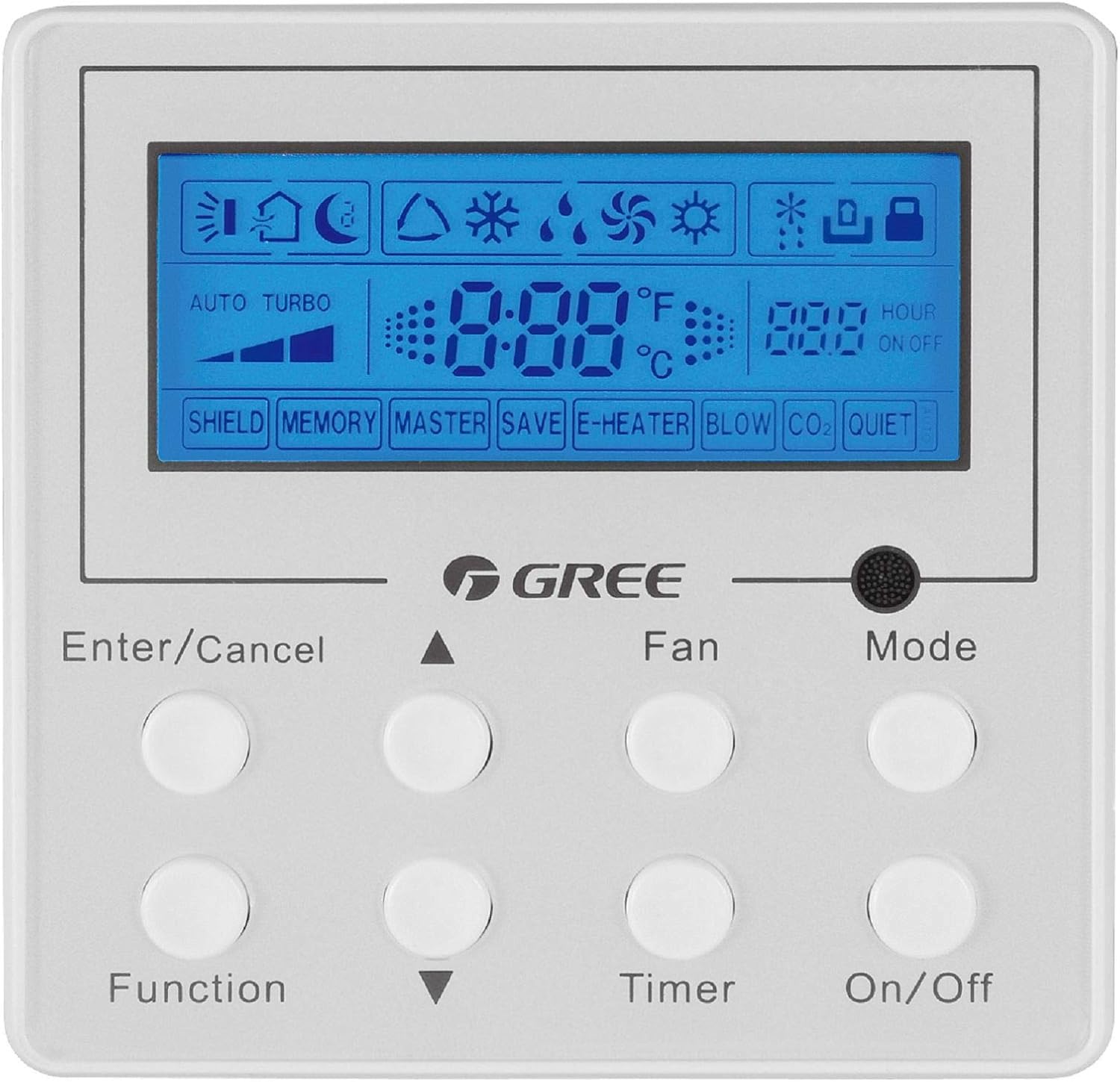 The Gree XK-60 controller features an LCD display and eight control buttons.