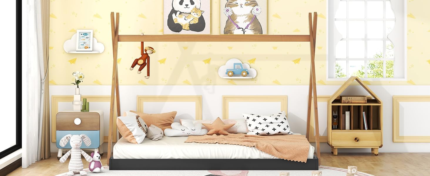 The Full Size Tent Floor Bed is designed to provide a low-profile sleeping solution for children, featuring a sturdy wood frame and a unique triangle structure that can be used for decoration or hanging lightweight items.